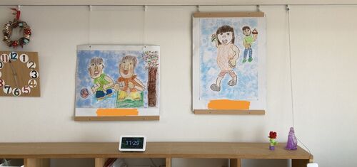 子供達が学校で描いてきた絵(計2枚)をDIYでピクチャーレールに吊るして飾ってみる事にした。 完成状態が上のタイトル画像。絵のサイズはめちゃくちゃでかい。2枚とも、絵本体よりさらに大きな厚紙で額装されたようになっており、サイズは ・横長の絵:横55セ…
